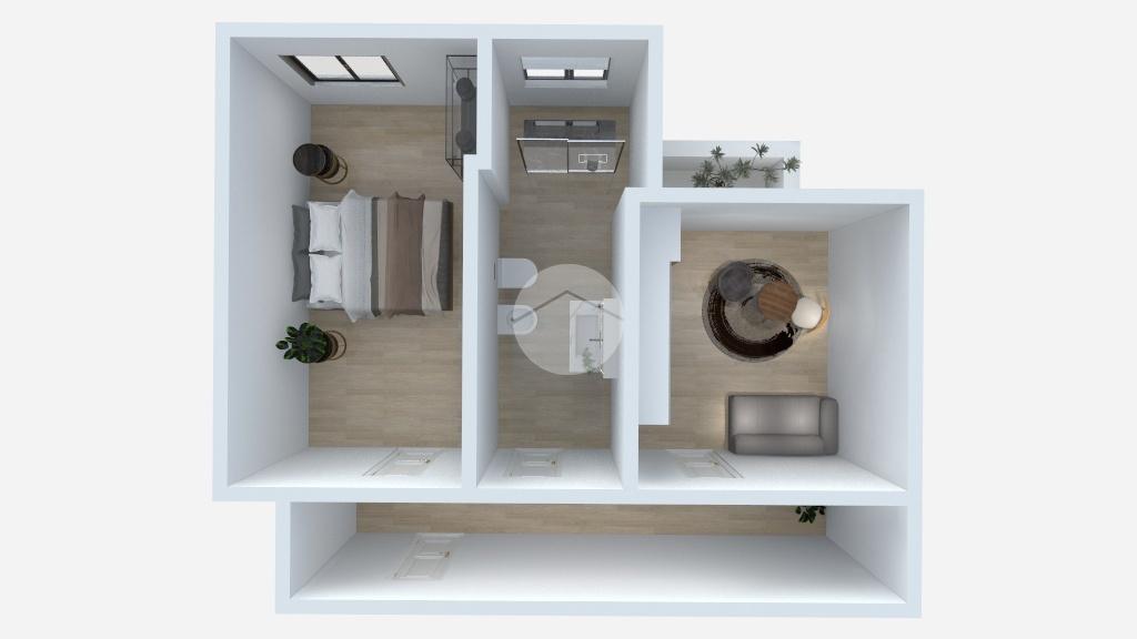 Ingresso in disimpegno da cui accediamo ai vari ambienti della casa, ove subito sulla destra troviamo la zona living con cucina a vista, con porta finestra che permette l'accesso al balcone dell'appartamento con affaccio sulla corte inerna. A seguire camera matrimoniale, anch'essa finestrata con medesimo affaccio della zona giorno. Per finire, bagno finestrato con box doccia.
