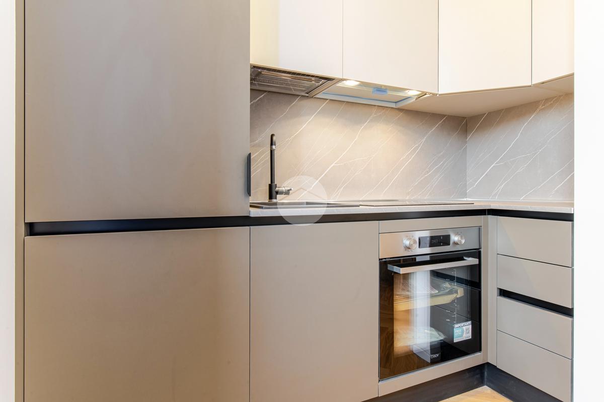 Cucina a vista Aran realizzata su misura, completa di elettrodomestici (piano a induzione, cappa integrata e lavastoviglie). Completano la soluzione infissi in PVC con doppio vetro, porta blindata classe 3 e impianto di aria condizionata in tutti gli ambienti.
